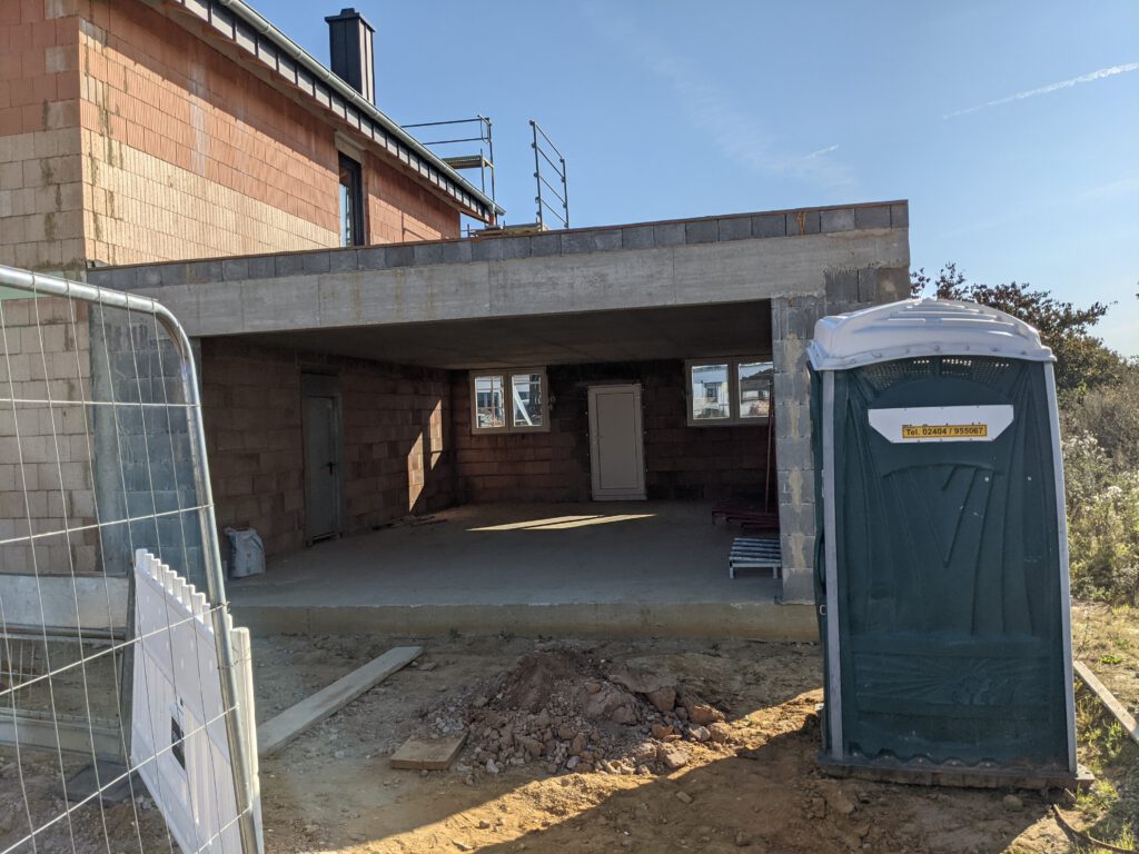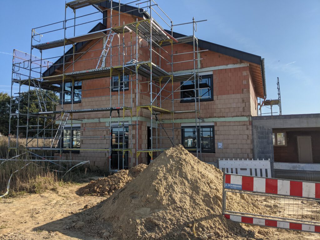 zumindest so fast.. Eine Scheibe der Terrassentür ist kaputt und muss deshalb nachbestellt werden. Von den Feinheiten abgesehen (noch keine Fenstergriffe montiert und die Flügel noch nicht justiert) sind jetzt aber zumindest erst einmal alle Fenster an Ort und Stelle. Auch die Garagenhintertür ist drin. Dummerweise konnte die Bauhaustür nicht eingesetzt werden, da sie zu klein für die Türöffnung ist und erst mit Holzbalken verstärkt werden muss, damit sie passt. Noch blöder ist, dass unsere Rumänen vor zwei Tagen erst sämtliche Holzreste vom Rohbau abgeholt und entsorgt haben. Also kann die Bautür erst morgen eingesetzt werden, wenn das passende Holz da ist. Aber vielleicht geht es dann nun auch endlich mit Elektrik, Sanitär und Heizung vorwärts.