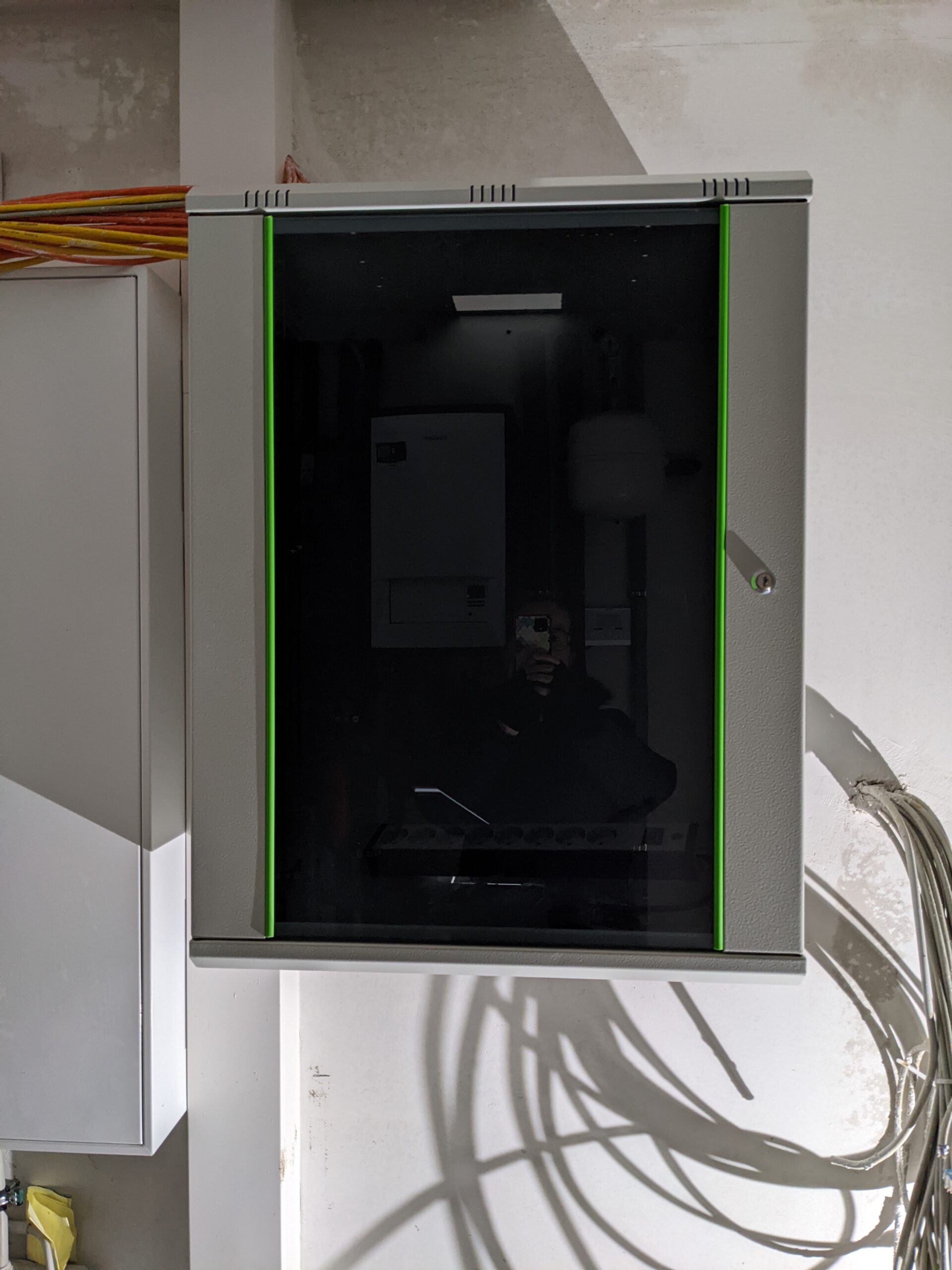 An den strategisch wichtigen Stellen haben Stefan und mein Schwiegerpapi schon ein paar Glühbirnen angebracht. Wir haben zwar noch keine Schalter, um diese auch benutzen zu können. naja.. 🙂 Und nachdem Stefan nun schon seit Wochen damit hadert, selber noch nichts im Haus tun zu können, hat er dann gestern auch endlich seinen Netzwerkschrank aufgehängt. Mit der Bestückung hat er aber noch nicht begonnen. Er teilt sich das jetzt häppchenweise ein, damit das Gefühl etwas tun zu können, nicht schon so schnell wieder vorbei ist. Daran wird er dann zurückdenken, wenn wir darüber jammern, wie anstrengend das Verlegen des Laminats im Obergeschoss ist 😉