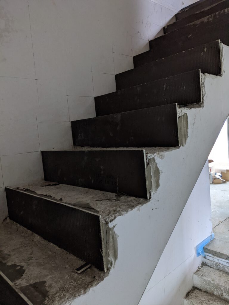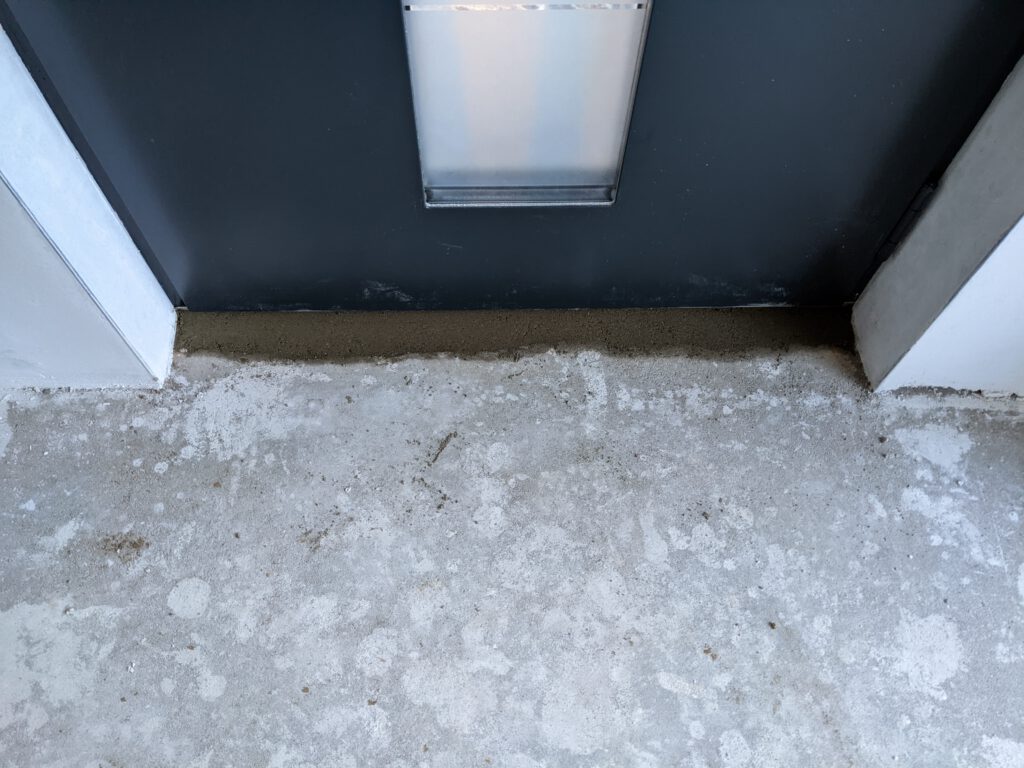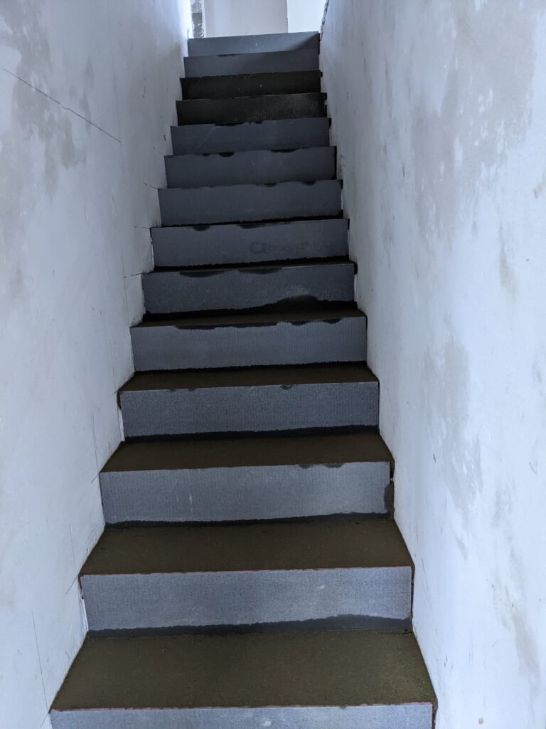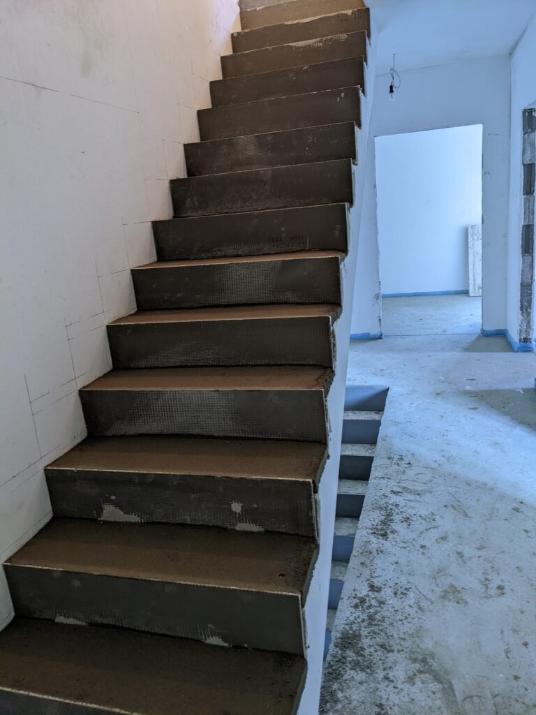 Still und heimlich wurde auch irgendwann innen vor der Haustür der noch fehlende Estrich aufgebracht. Somit ist der Eingangsbereich fertig und es kann dann bald gefliest werden. Auch unsere Treppenstufen im Erd- und Obergeschoss wurden angepasst und mit Estrich angeglichen. Aus irgendeinem Grund haben die Rumänen zumindest mal den Treppenbau verkackt und da müssen wir uns noch mal drüber unterhalten.