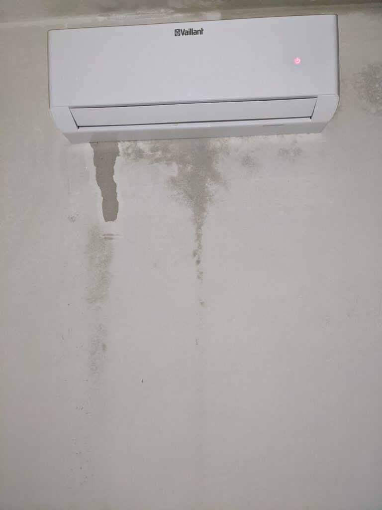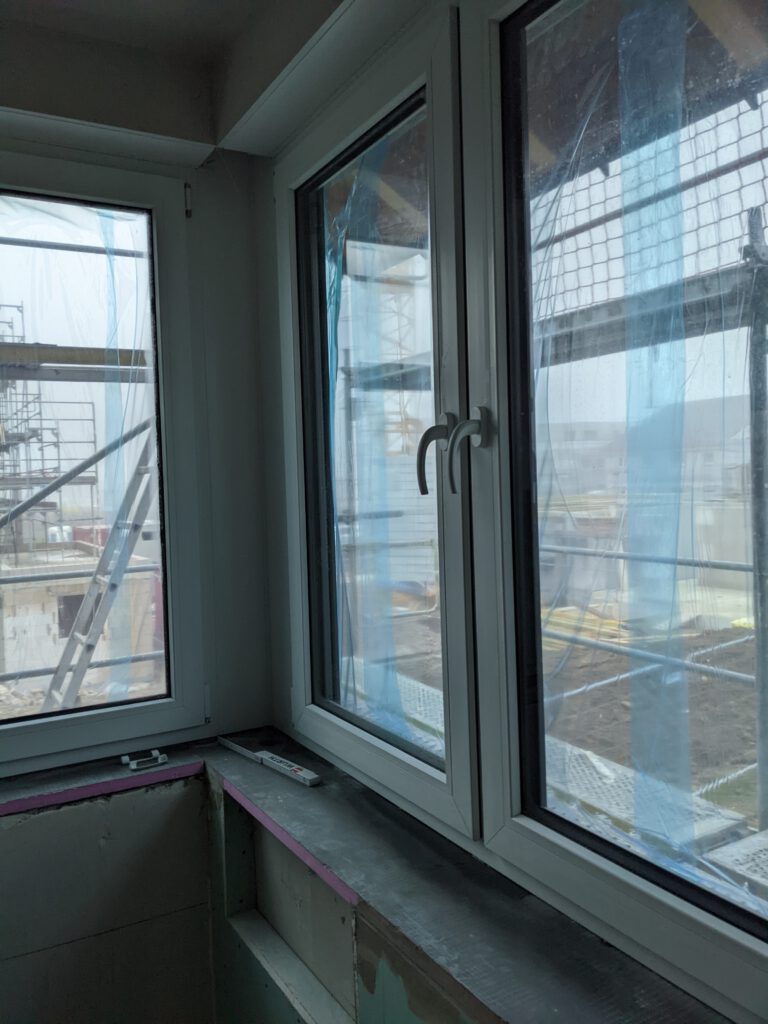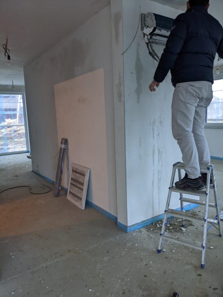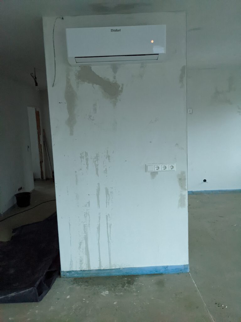 Was war also jetzt in dieser Woche los? Letzten Samstag waren die Fensterbauer noch da und haben die Fenstergriffe angebracht und in den Eckfenstern im Ober- und Untergeschoss die noch fehlende Dämmung angebracht und anschließend Verkleidung draufgepappelt. Nachdem letzte Woche außerdem auch die Klimageräte installiert wurden und wir diese nach Einbau zusätzlich im Entfeuchtungsmodus laufen hatten, stellte sich jetzt bei zwei Geräten ganz fix heraus, dass diese undicht sind und tropfen. Also war letzten Freitag der Heizungsbauer noch da um die Anschlüsse zu prüfen. Die wurden nochmals festgezogen – hat aber nix gebracht. Die beiden Schönheiten haben weiterhin getropft. Also war der Chef dann am Montag höchstpersönlich da, um auf Fehlersuche zu gehen. Es hat sich dann herausgestellt, dass beide Klimageräte zu tief hängen, so dass der Ablauf des Kondenswassers so gerade eben nicht funktionieren kann. Also wurde der Winkel der Ableitung verändert, die Wand wieder zugeputzt und das war es dann jetzt hoffentlich auch.