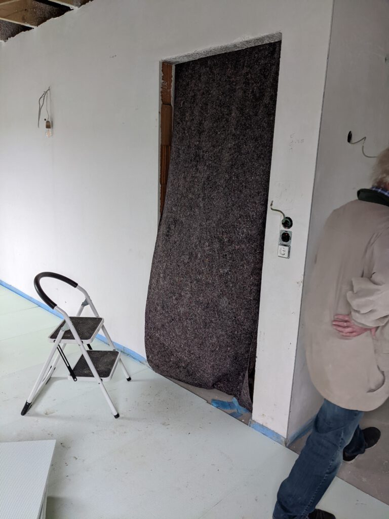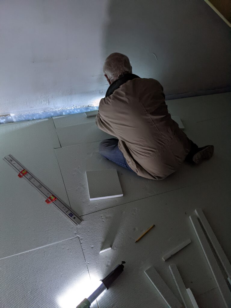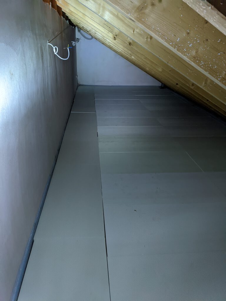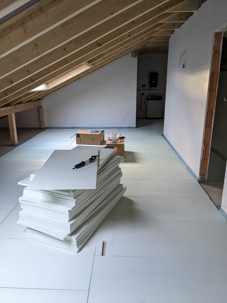 Im Mobau habe ich 100qm Styrodurdämmung gekauft und habe mit meinem Schwiegervater den Boden im Dachgeschoss damit abgedeckt in der Hoffnung, dass dann die Wärme der Fußbodenheizung größtenteils im Boden bleibt. Zur Erinnerung: im Dachgeschoss hat nur der Boden der größeren Dachseite Fußbodenheizung, da der restliche Teil als Speicher genutzt werden soll. Den Aufgang zum Dachgeschoss haben wir ebenfalls mit Dämmung abgedeckt und den Türdurchgang mit Malervlies zugehangen. Außerdem haben wir die Klimageräte nun zusätzlich auf Aufwärmen statt Entfeuchten gestellt. Ergebnis: die zusätzliche Wärme durch die Klimageräte macht es im Obergeschoss schön warm, dafür passiert im Untergeschoss so gut wie nix an Wärmezuwachs. Da ist einfach der Wurm drin. Irgendetwas stimmt nicht. Dafür ist es im Dachgeschoss jetzt arschkalt und wieder ziemlich feucht. Wir wissen immer noch nicht wieso. Nachdem wir jetzt aber festgestellt haben, dass die Feuchtigkeit die ersten Schimmelspuren hinterlässt, haben wir für kommende Woche den Baugutachter angefordert. Mal schauen, ob der uns weiterhelfen kann.