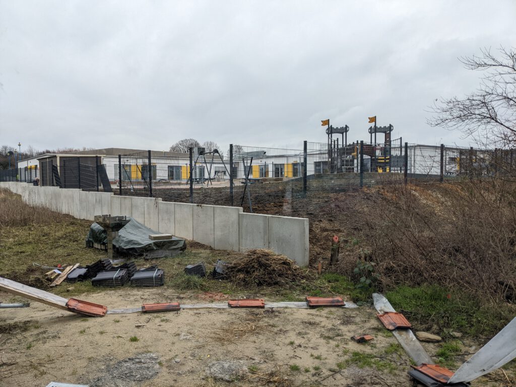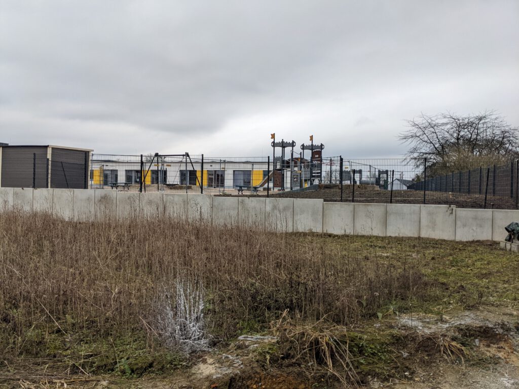 Beim Kindergarten hinter unserem Haus wird gerade der Zaun gesetzt. Ich bin gespannt, wo dann die Bepflanzung hinkommt, damit die kleinen Racker nicht permanent am Zaun stehen und uns beim Grillen zuschauen 🙂
