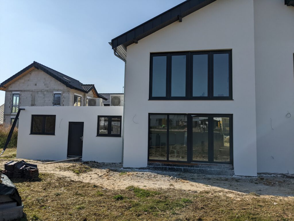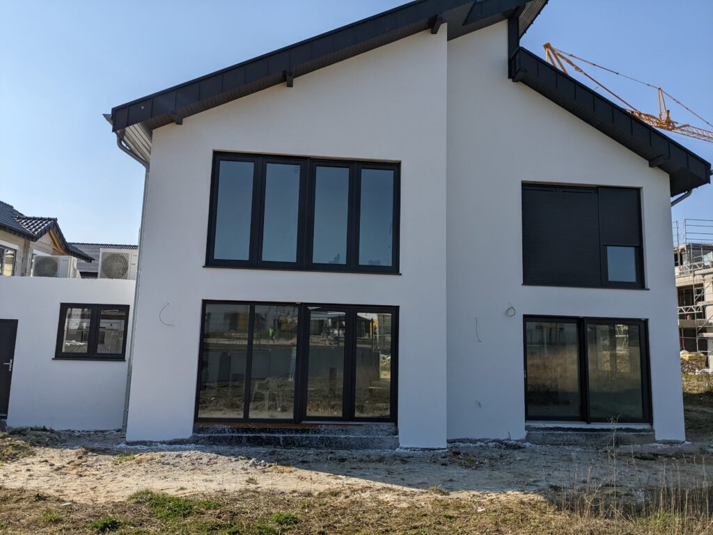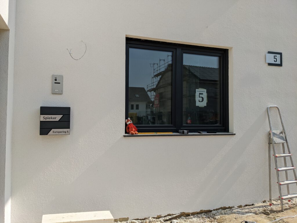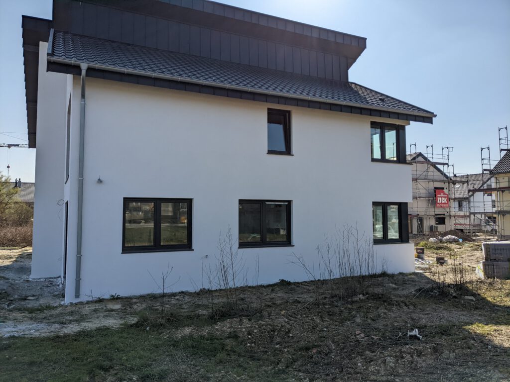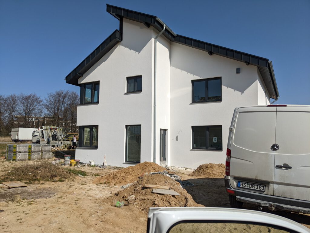 Davon abgesehen hat sich in dieser Woche auch wieder einiges getan. Der Dachdecker war da und hat die Fallrohre vom Haus angebracht. Die finale Abdichtung des Garagendachs und das Anbringen des Fallrohrs desselbigen sollen jetzt in der kommenden Woche erfolgen. Nachdem jetzt das Gerüst abgebaut wurde, kann man das ganze Haus in seiner finalen Fassung bewundern. Also mir gefällt es sehr – zugegeben, wäre auch doof, wenn es anders wäre 😉