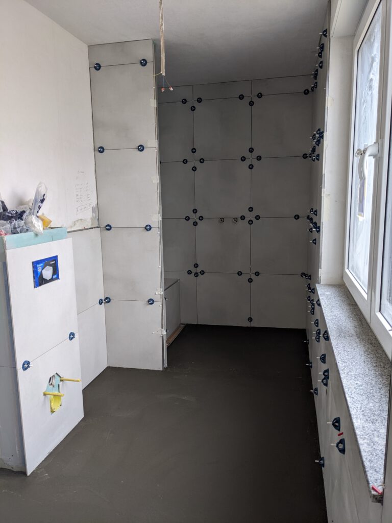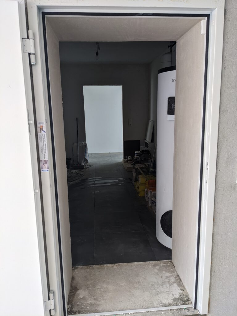 Die Baustellentür zwischen Garage und Haus musste auch der finalen Tür weichen. Eigentlich hatten wir eine Tür von Hörmann bestellt. Eingebaut ist jetzt aber eine Tür von Novoferm mit den selben Attributen. Die Lieferzeiten von Hörmann sind mittlerweile echt unterirdisch, was sich leider auch bei unserem Garagentor widerspiegelt. Selbiges sollte nämlich eigentlich in dieser Woche geliefert und eingebaut werden. Aber nach letztem Informationsstand hat sich der neue Liefertermin auf KW 17 verschoben, Ende offen. Es gibt keine Zusage, dass dieser Termin wirklich gehalten werden kann. Nachdem jetzt aber die endgültige Tür eingebaut ist, konnte auch die Laibung noch verputzt werden. Fehlen noch die restlichen Fliesen innen und aussen vor der Tür. Jetzt sieht es aber wirklich schon fast fertig aus 🙂