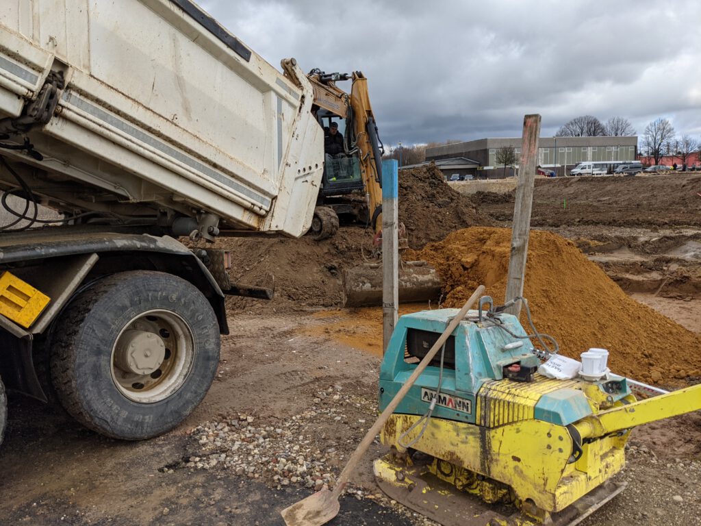 Nachdem der Sand dahin abgekippt wurde, wo einmal unsere Garage stehen soll – hat der Lkw direkt den nutzlosen Lehmboden wieder aufgeladen und mitgenommen.