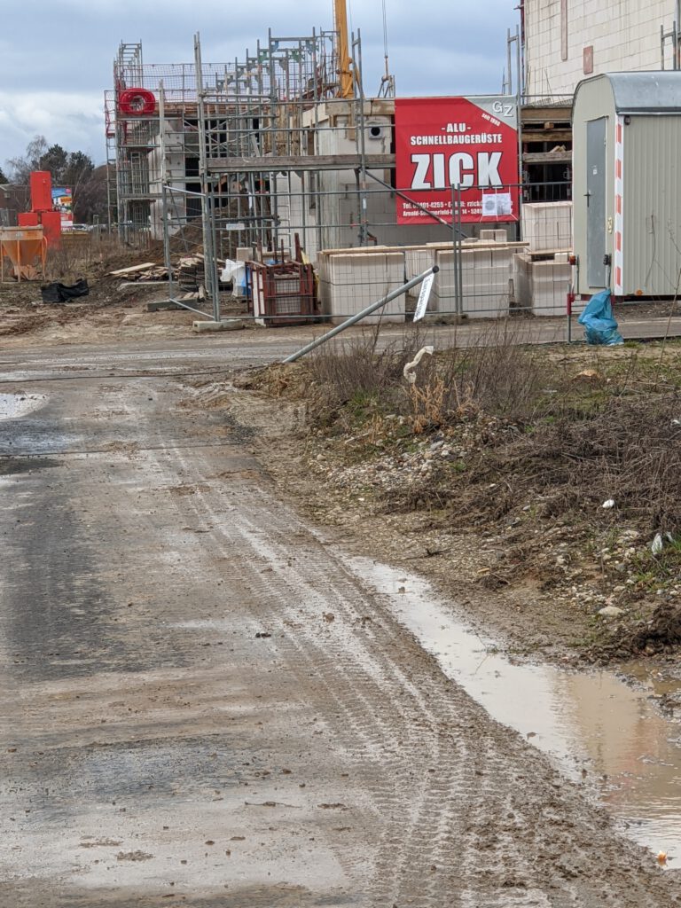 Nun bin ich ja eine gesellige Type und rede gern (und wahrscheinlich auch oft zu viel). Ende vom Lied, der Chef entscheidet kurzerhand um. Es wird mit unserer Baustelle begonnen! Nun bin ich keine zwölf mehr, aber ein lautes Yippie Yay Yo Schweinebacke musste dann doch raus. Zu sagen, dass ich mich gefreut habe, wird dem vielleicht auch nicht wirklich gerecht. Als ich später am Abend mit Stefan noch mal durch das Wohngebiet gedüst bin, da hatten die doch tatsächlich schon mit baggern angefangen. Und heute sah es dann so aus: