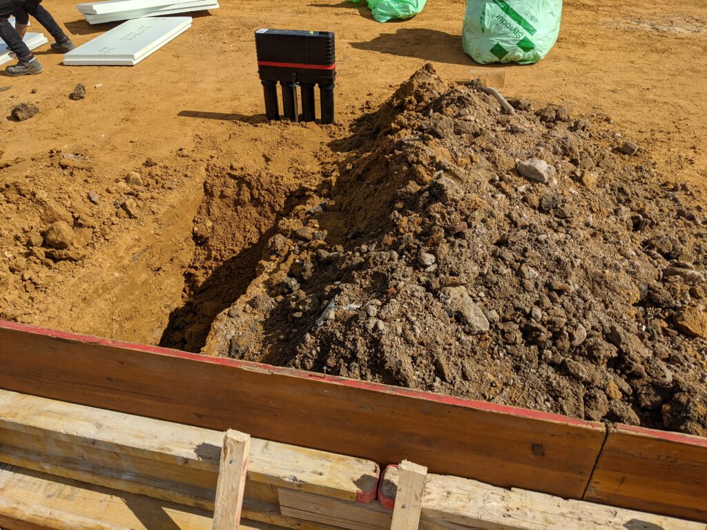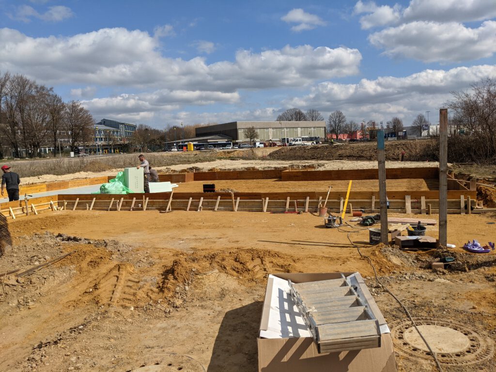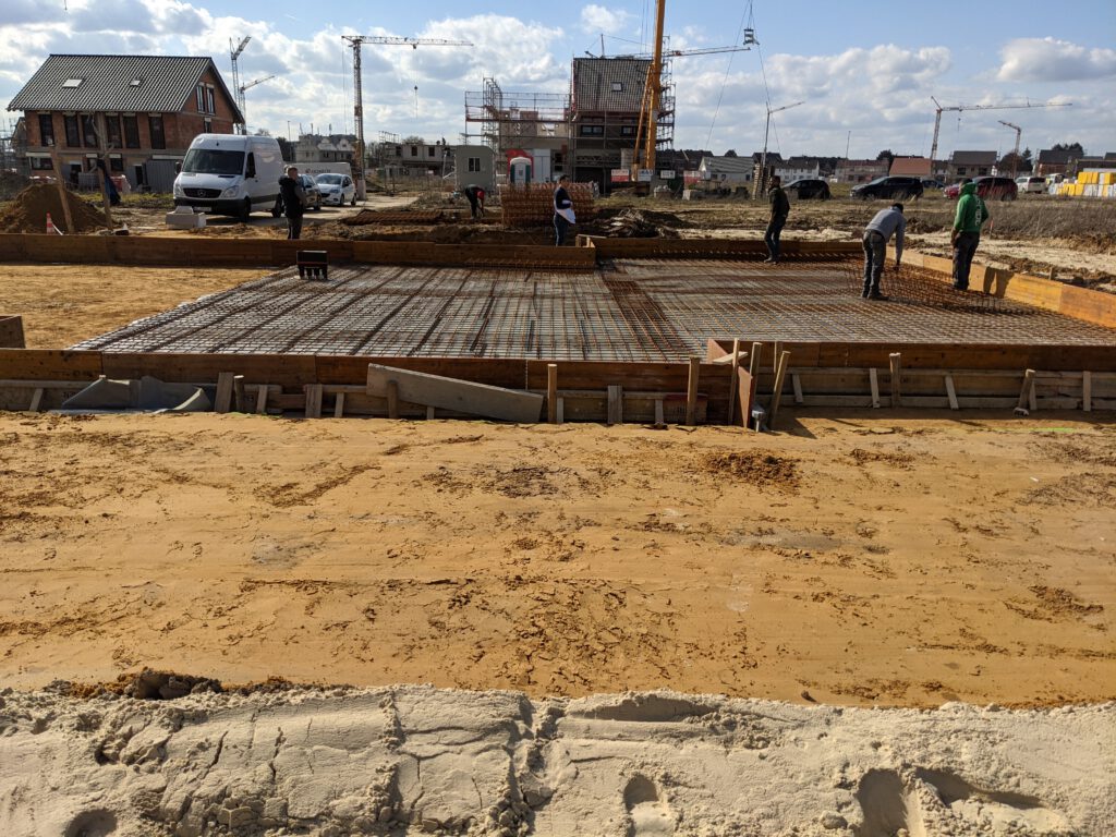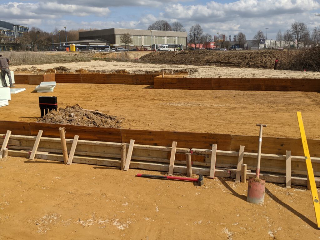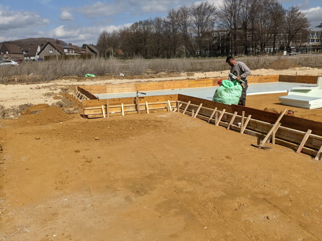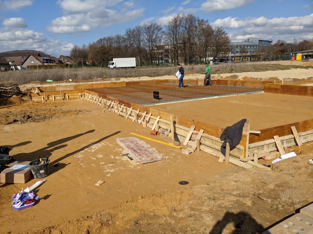 In diesem Fall ist damit nur Positives gemeint, denn es geht gerade einfach total schnell vorwärts. Wo gestern Abend noch nichts war, ist heute schon eine komplette Verschalung gemacht, die erste Dämmschicht gelegt und der Bewehrungsstahl aufgebracht. Die Vorbereitungen für die Bodenplatte sollen morgen spätestens gegen 14 Uhr abgeschlossen sein. Montag morgen kommt dann der Statiker zur Abnahme der Verlegung des Stahls, am Dienstag der Baugutachter und Mittwoch kommt der Beton für die Platte. Und nach Ostern, um genau zu sein am 07.04. sollen dann unsere Steine angeliefert werden. Schon krass, wie schnell das gerade geht. Hoffe, das bleibt so. Dann steht einem Umzug zum Jahresende wohl tatsächlich nichts im Weg. Heißt also: Daumen drücken!
