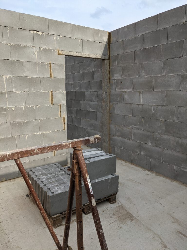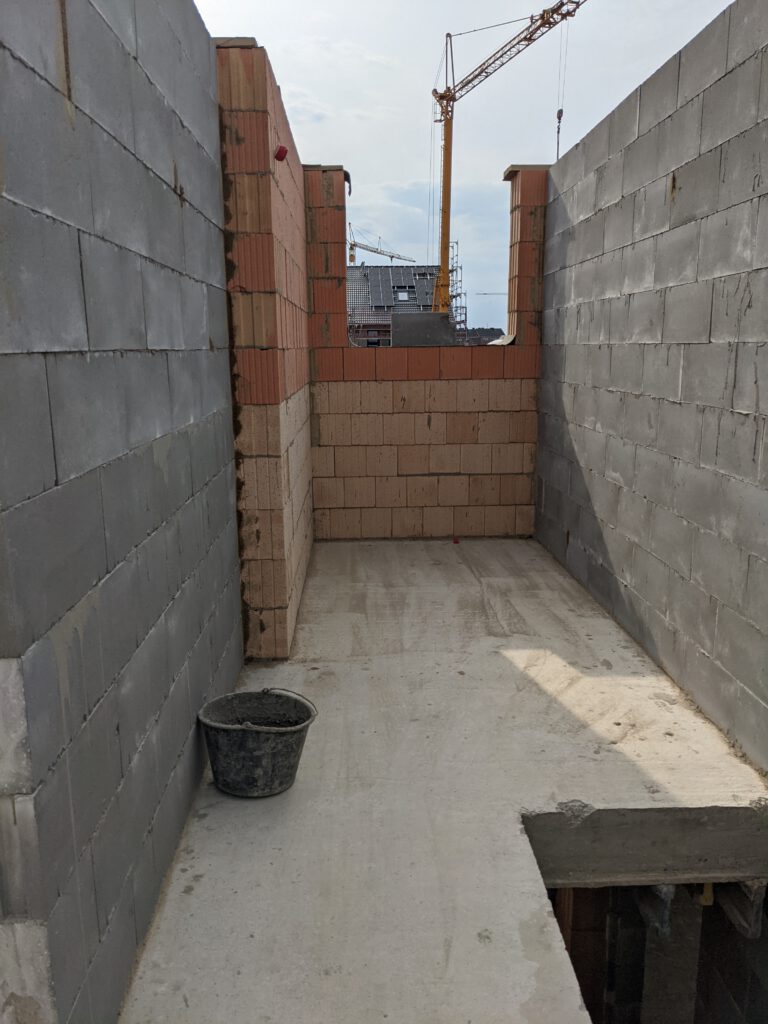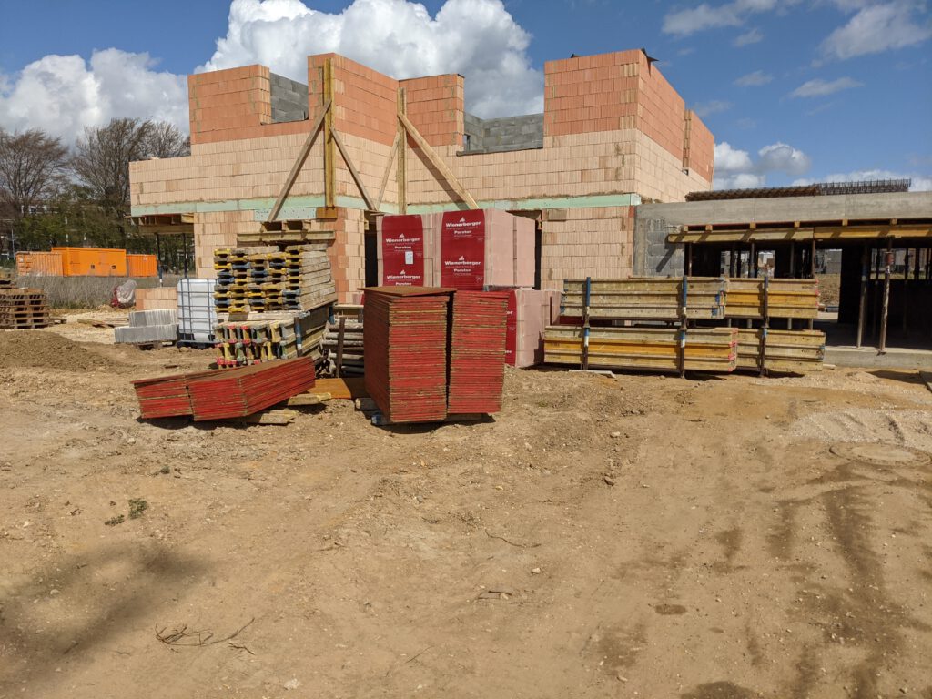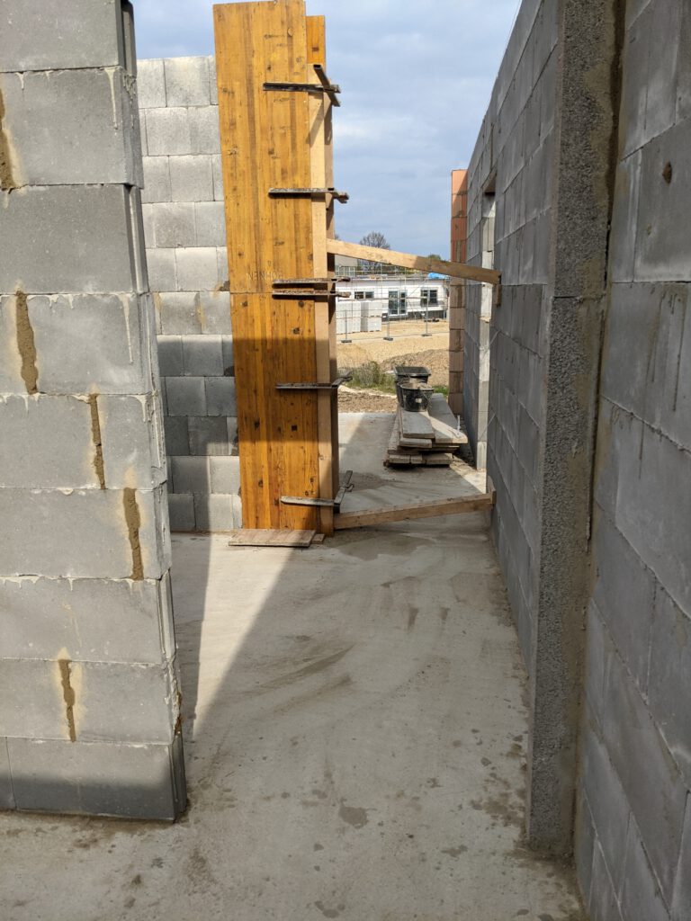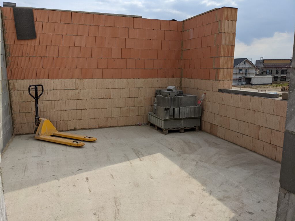 Ein kurzes Update: unser Bauzug ist noch nicht aus Rumänien zurück. Zumindest habe ich die Jungs (Stand heute, Mittwoch) noch nicht zu Gesicht bekommen, habe allerdings auch nicht damit gerechnet. Der zweite Bauzug unserer Baufirma hatte zwischenzeitlich die Innenwände des Obergeschosses fertiggestellt. Sieht ziemlich gut aus. Jetzt fällt es gar nicht mehr schwer, sich die zukünftigen Räume vorzustellen. Auch die Verschalungen für die Obergeschossdecke wurden mittlerweile angeliefert und auf die Zwischendecke gehoben.