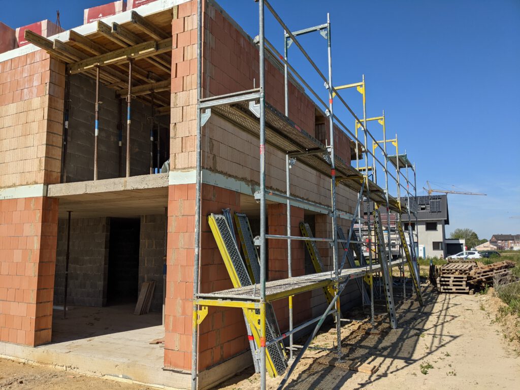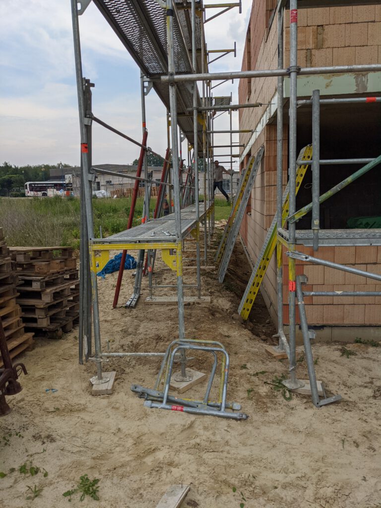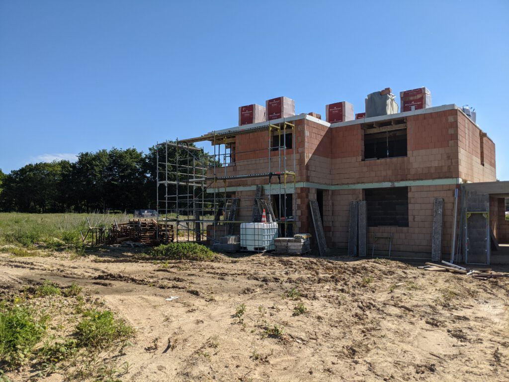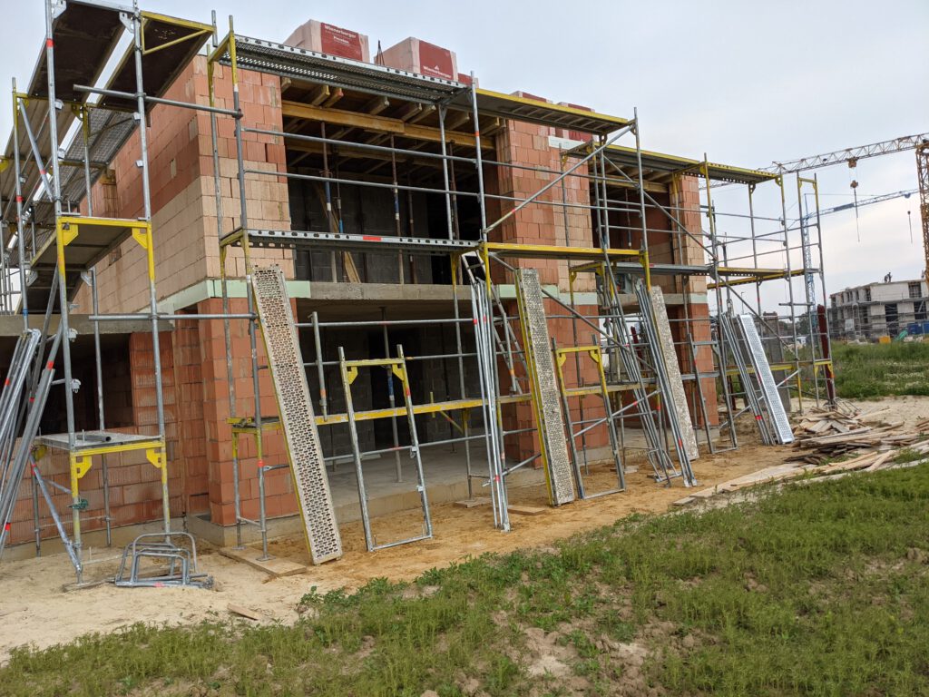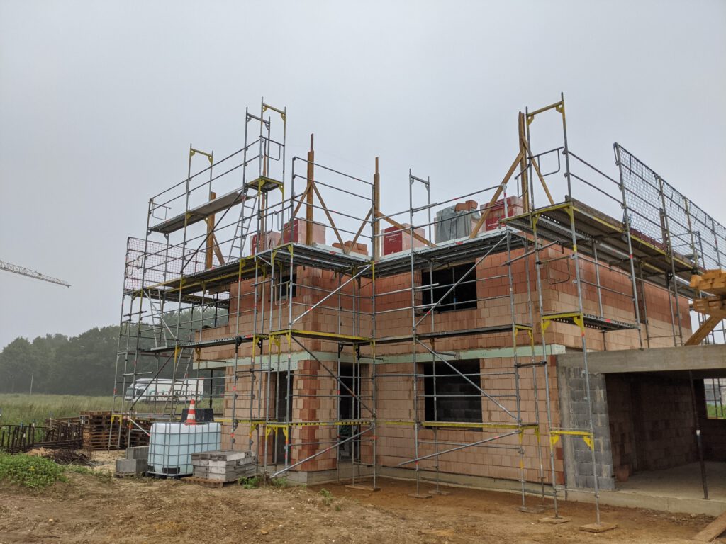 Donnerstag war dann Fronleichnam – ein weiterer Tag an dem effektiv nix passiert, weil Feiertag – und so gern ich die zusätzlichen freien Tage sonst auch mag, im Moment passen sie einfach nicht in meinen Plan. Und so fahre ich also am heutigen Freitag Vormittag ohne jegliche Hoffnung auf Fortschritt zur Baustelle, nur um dann genau hinter zwei Transportern der Gerüstbaufirma ins Neubaugebiet einzubiegen. Und wären die nicht zu unserer Baustelle unterwegs gewesen (sie haben noch mindestens 15 weitere Baustellen dort), ich glaube, ich hätte sie verfolgt und denen die Gerüstteile von der Ladefläche gemopst. Das war aber glücklicherweise nicht nötig 🙂
