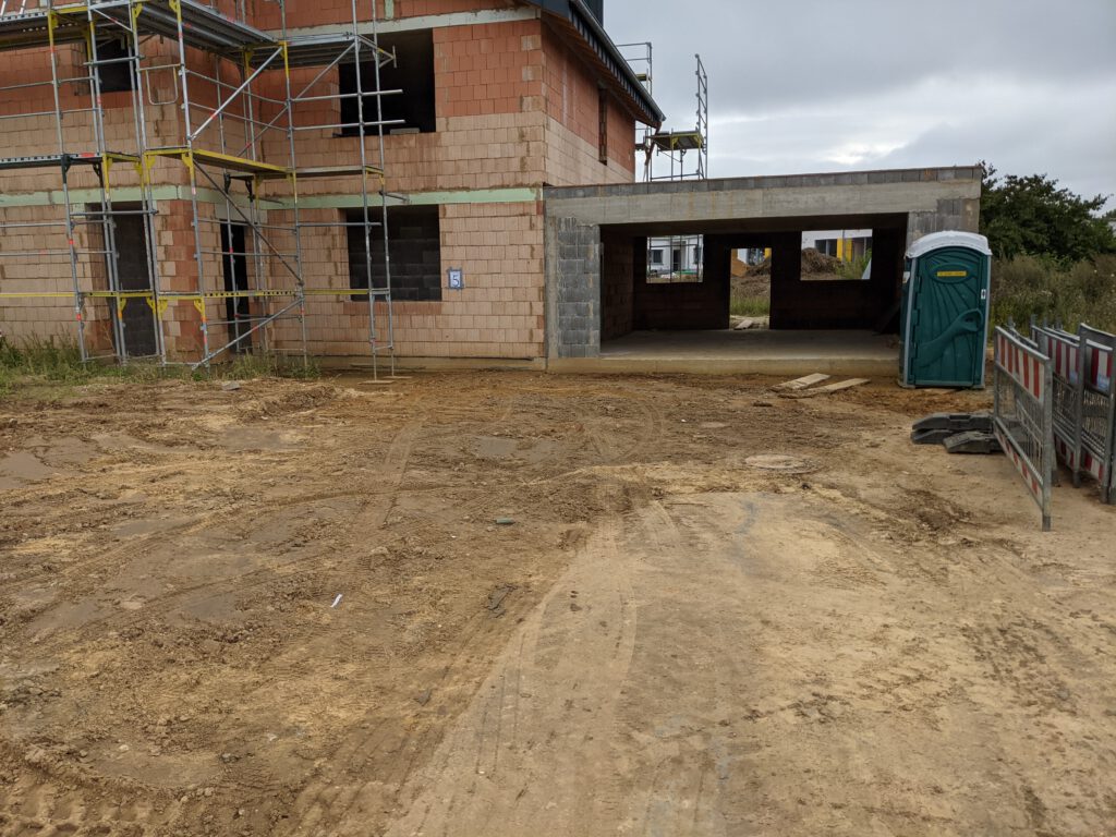 Wir haben einen GaLa Bauer beauftragt, um die vorläufige Garagenzufahrt und die Zuwegung zum Haus umzusetzen. Da die Straße erst in zwei Jahren endgültig fertig sein und das finale Straßenniveau erreicht haben wird, können wir den vorderen Bereich vorerst nur provisorisch anlegen lassen. Das Wichtigste ist dabei vor allem die Garagenzufahrt, die auch in der Übergangsphase nutzbar sein muss. Nähere Infos gibt es, wenn es so weit ist.
